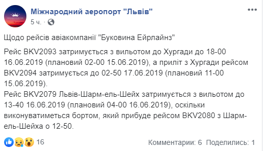 Рейс BKV2093 задерживается с вылетом в Хургаду до 18:00 16 июня (плановый 02:00 15 июня), а прилет из Хургады рейсом BKV2094 задерживается до 02:50 17 июня (плановый 11:00 15 июня). Рейс BKV2079 "Львов - Шарм-эль-Шейх" задерживается с вылетом до вечера 16 июня (плановый 04-00 16 июня).