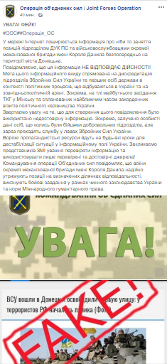 "В сети интернет распространяется информация о якобы занятии позиций подразделением ДУК ПС и военнослужащими отдельной механизированной бригады имени Короля Даниила непосредственно на территории города Донецка. …Эта информация не соответствует действительности", - говорится в сообщении штаба ООС в соцсети.