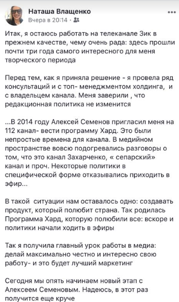 "Итак, я остаюсь работать на телеканале ZIK в прежнем качестве, чему очень рада: здесь прошли почти три года самого интересного для меня творческого периода. Перед тем, как я приняла решение - я провела ряд консультаций и с топ-менеджментом холдинга, и с владельцем канала. Меня заверили, что редакционная политика не изменится... В 2014 году Алексей Семенов пригласил меня на 112 канал - вести программу Хард. Это были непростые времена для канала. В медийном пространстве вовсю подогревались разговоры о том, что это канал Захарченко, "сепарский" канал и проч. Некоторые политики в специфической форме отказывались приходить в эфир... В такой ситуации нам оставалось одно: создавать продукт, который полюбит страна. Так родилась программа Хард, которую полюбили все: вскоре и политики начали ходить в эфиры. Так я получила главный урок работы в медиа: делай максимально честно и интересно свою работу - и это будет лучший маркетинг. Сегодня мы опять начинаем новый этап с Алексеем Семеновым. Надеюсь, в этот раз получится еще круче", - написала Наталья Влащенко.
