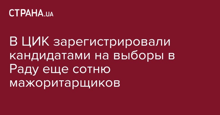 "Сегодня комиссия зарегистрировала 100 кандидатов в народные депутаты Украины в одномандатных избирательных округах, в том числе: баллотирующихся в порядке самовыдвижения - 97, выдвинутых политическими партиями - 3", - говорится в сообщении.