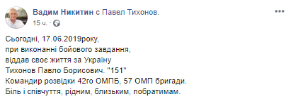 В зоне ООС на Донбассе во время выполнения боевого задания погиб украинский военный Павел Тихонов. Об этом на своей странице в соцсети сообщает руководитель Центра оказания помощи участникам АТО Кировоградской ОГА Вадим Никитин.