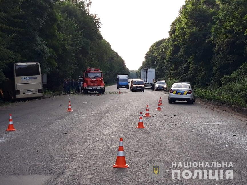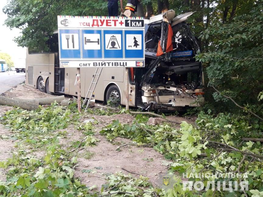 "Около 02:45 18 июня на линию 102 поступило сообщение о ДТП в пгт Войтовцы Волочиского района Хмельницкой области. По предварительным данным, 58-летний львовянин, управляя автобусом международного сообщения "Неаполь-Херсон", допустил столкновение с автомобилем-тягачом Iveco с прицепом, который двигался в попутном направлении. Автобус ударился в заднюю часть прицепа, в результате чего съехал в кювет, где столкнулся с деревом", - уточнили в полиции.