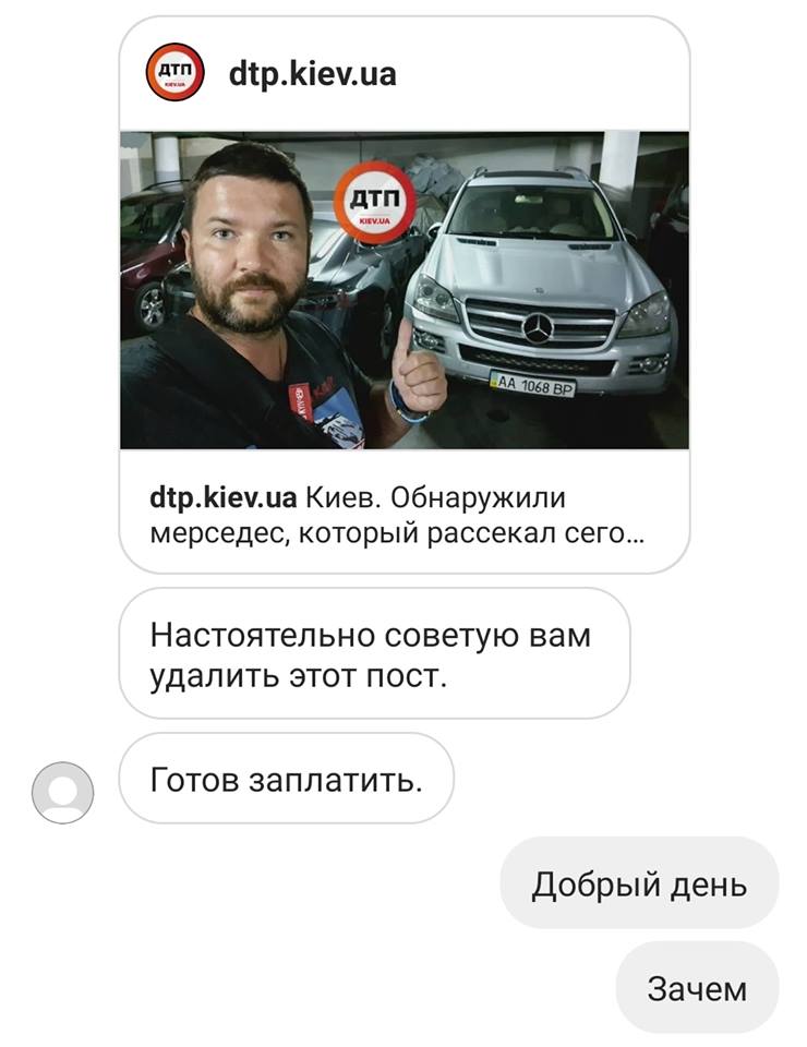 После того как в Киеве обнаружили автомобиль Mercedes, который 17 июня заехал на новый стеклянный пешеходный мост, а фото машины выложил паблик dtp.kiev.ua Влад Антонов в социальных сетях, ему поступило предложение удалить посты за 100 долларов. Об этом сообщил сам Антонов в Facebook.