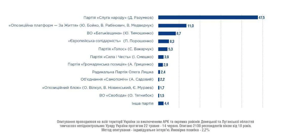 Оказалось, что первое место занимает партия "Слуга народа", ее поддержали 47,5% тех респондентов, которые определились со своим выбором.