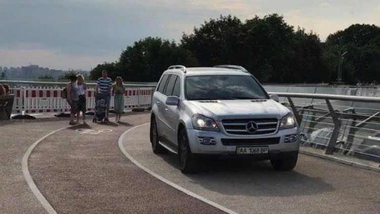 17 июня в социальных сетях появилось фото, на котором серебристый Mercedes Benz GL припарковался на новом пешеходно-велосипедном мосту в Киеве. Снимок разместил Дмитрий Макагон на своей странице в Facebook. "Тем временем на велопешеходном мосту хорошо. А вы говорите на велосипеде проехать нельзя. Зрадофилы!" - написал он.