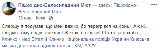 "Сначала я подумал, что мне трудно, потому что перегрелся на солнце. Ан нет ... гвоздей тому водителю и жезлов! Жезлов и гвоздей! Что за наглец?" - говорится в сообщении Моста в соцсети. В посте были отмечены мэр Виталий Кличко, Нацполиция и КГГА.
