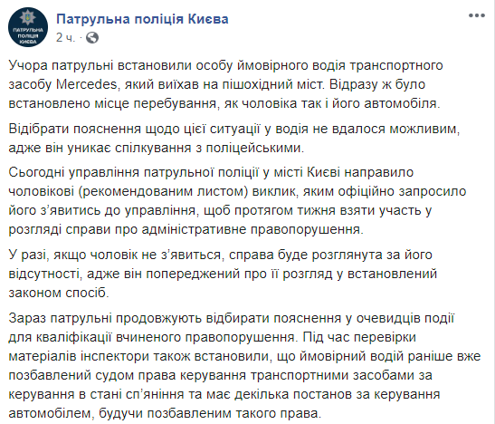 Пресс-служба патрульной полиции Киева на своей странице в Facebook сообщила, что предполагаемый водитель ранее уже был лишен судом права управления транспортными средствами за управление в состоянии опьянения и имеет несколько постановлений за управление автомобилем, будучи лишенным такого права. Патрульная полиция усматривает в действиях водителя сразу несколько административных правонарушений: управление автомобилем, будучи лишенным такого права судом, движение транспортного средства по пешеходной дорожке и создание аварийной ситуации.