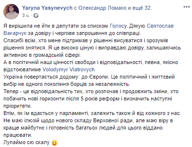 "Я решила не идти в депутаты по списку Голоса. Спасибо Святославу Вакарчуку за доверие и очередное приглашение к сотрудничеству. Спасибо всем, кто меня поддержал в решении выдвигаться и понял решение сняться. Я это высоко ценю и оправдаю доверие, оставаясь активной в общественной сфере", - написала Ярина Ясиневич.