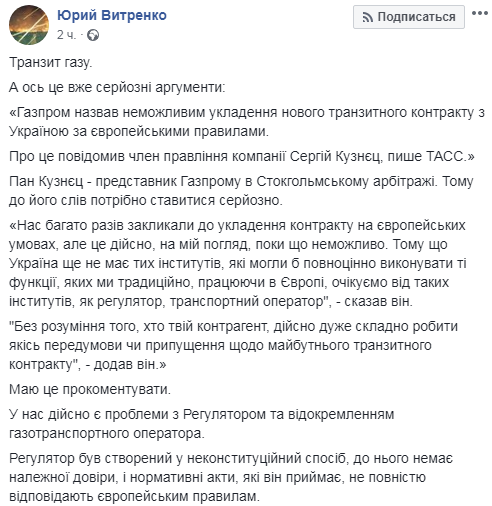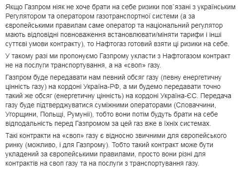 Вместо заключения нового договора о транзите газа из России в ЕС через Украину в "Нафтогазе" предложили поставлять топливо в Европу на условиях "своп". Также предложено соединить газотранспортные системы двух государств. Об этом говорится на фб-странице исполнительного директора "Нафтогаза" Юрия Витренко во вторник, 18 июня.