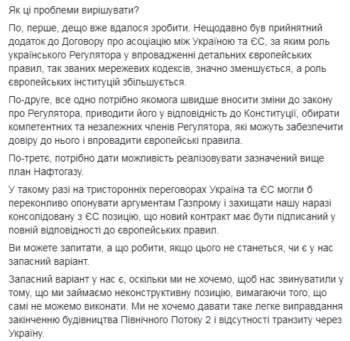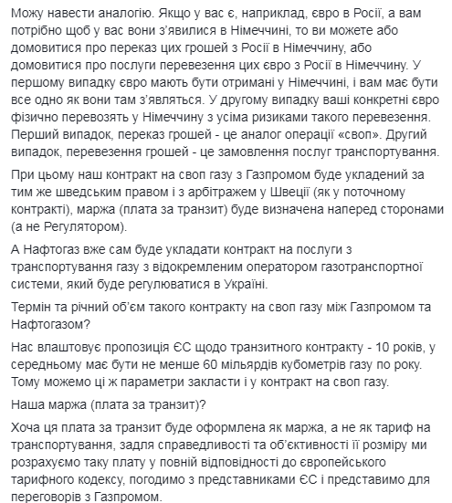 Нас устраивает предложение ЕС - обеспечить техническую возможность (мощности) для поступления газа из России в Украину в объеме не менее 90 млрд кубометров газа по году. То есть будет 30 млрд кубометров для дополнительных объемов транзита доступных как для газпромовского газа, так и для газа других компаний", - уточняется в опубликованном сообщении.