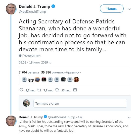 "И.о. главы Пентагона Патрик Шанахан проделал прекрасную работу. Но он решил не продолжать процесс утверждения (в должности постоянного главы оборонного ведомства - Прим. Ред.), так как хочет уделить больше времени семье", - написал он. Трамп пояснил, что назначит новым и.о. главы Пентагона Марка Эспера, который до сих пор занимал пост министра сухопутных сил США.