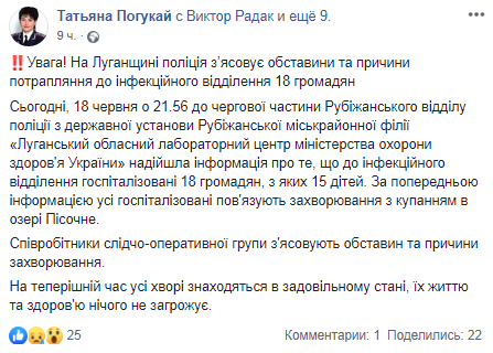 "На Луганщине полиция выясняет обстоятельства и причины попадания в инфекционное отделение 18 граждан", - написала она.