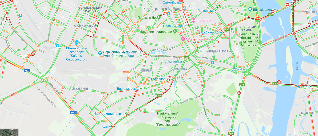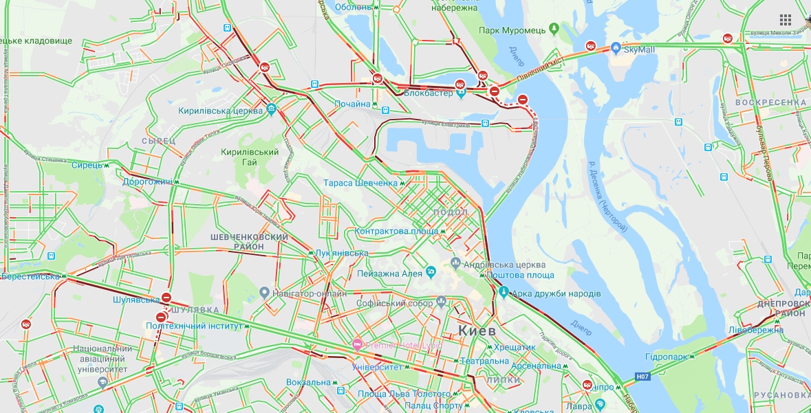 Сложнее всего проехать по проспекту Победы - от метро "Шулявская" до "Житомирской". Также стоят машины на Воздухофлотском проспекте и проспекте Леся Курбаса, улицах Вадима Гетьмана, Юрия Ильенко, Вячеслава Черновола, бульваре Тараса Шевченко, Владимирском спуске, Набережном шоссе, проспекте Валерия Лобановского.