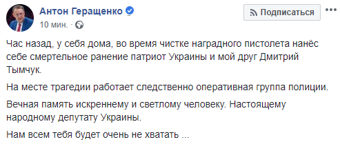 "Час назад, у себя дома, во время чистке наградного пистолета нанёс себе смертельное ранение патриот Украины и мой друг Дмитрий Тымчук.