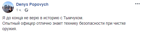 "Я до конца не верю в историю с Тымчуком. Опытный офицер отлично знает технику безопасности при чистке оружия" . - пишет журналист Денис Попович.