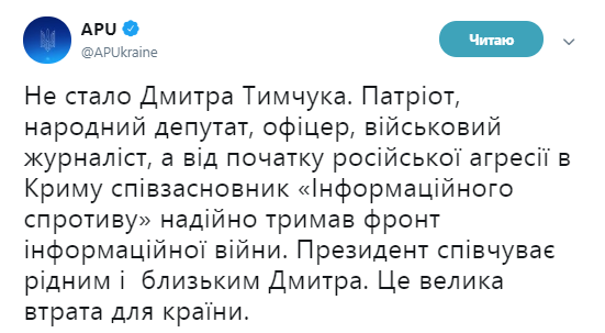 "Не стало Дмитрия Тымчука. Патриот, народный депутат, офицер, военный журналист, а с начала российской агрессии в Крыму соучредитель "Информационного сопротивления" надежно держал фронт информационной войны. Президент соболезнует родным и близким Дмитрия. Это большая потеря для страны" - говорится в сообщении в Twitter АП.