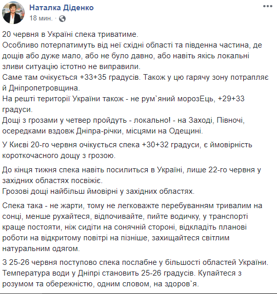 "Жара такая - не шутки, поэтому не балуйтесь продолжительным пребыванием на солнце, меньше двигайтесь, отдыхайте, пейте водичку, в транспорте лучше постоять, чем сидеть на солнечной стороне, отложите плановые работы на открытом воздухе на потом, защищайтесь светлой и натуральной одеждой. С 25-26 июня постепенно жара ослабеет в большинстве областей Украины. Температура воды в Днепре составляет 25-26 градусов. Купайтесь с умом и осторожностью, одним словом, на здоровье", - поделилась советом синоптик.
