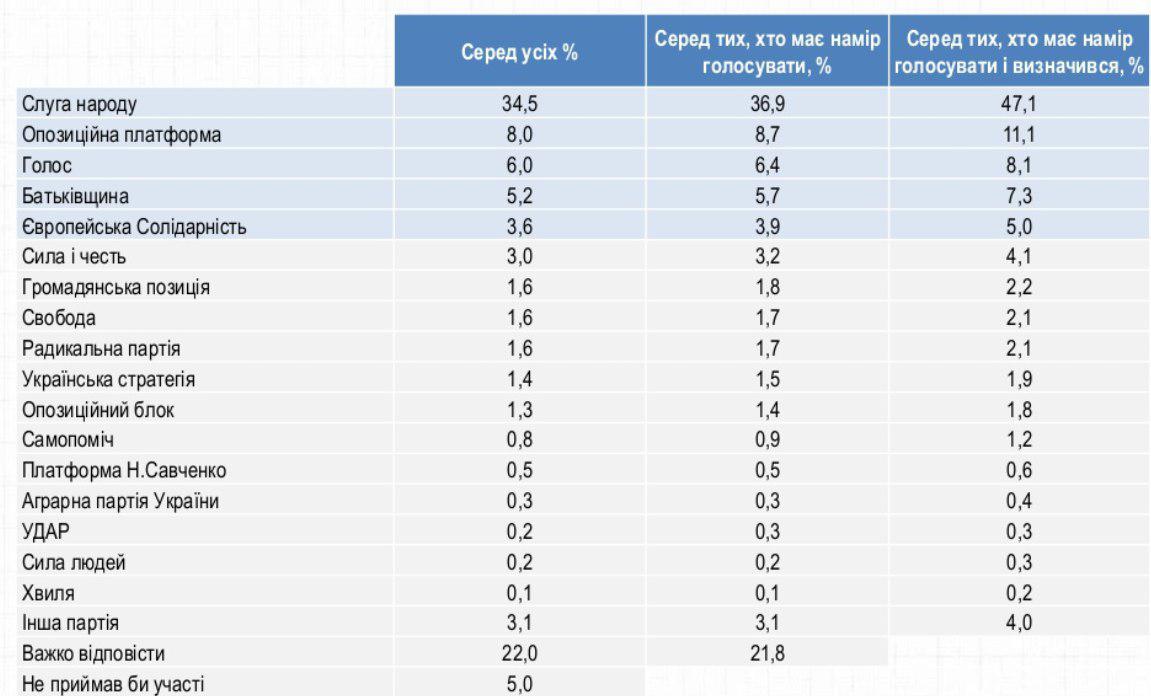 Так, согласно опросу, если бы парламентские выборы проходили в ближайшее воскресенье, за партию "Слуга народа" президента Владимира Зеленского готовы проголосовать 47,1% тех, кто намерен голосовать и определился с симпатиями (34,5% из всех опрошенных).