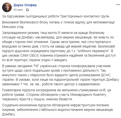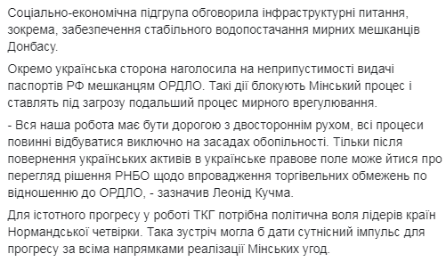"Только после возвращения украинских активов в украинское правовое поле может идти речь о пересмотре решения СНБО по внедрению торговых ограничений по отношению к ОРДЛО, - цитируется Кучма на фб-странице его пресс-секретаря Дарки Олифер по итогам заседания ТКГ в Минске.