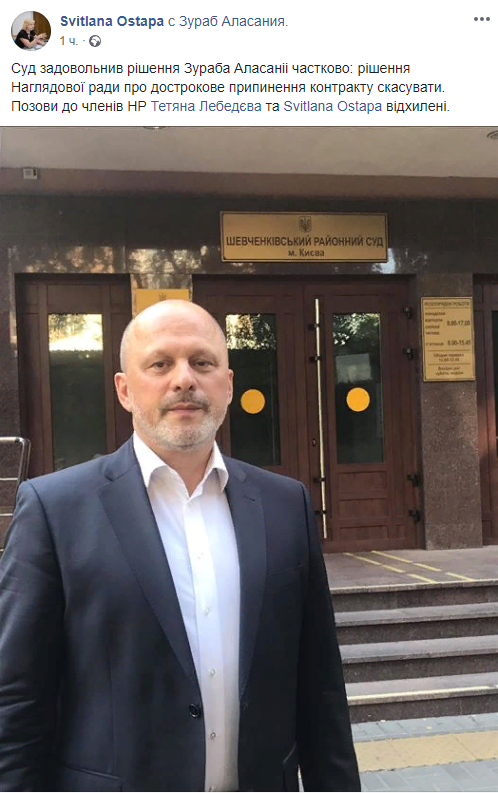 "Суд удовлетворил решение Зураба Аласании частично: решение наблюдательного совета о досрочном прекращении контракта отменить. Иски к членам НC Татьяны Лебедевой и Светланы Остапы отклонены", - написала она.