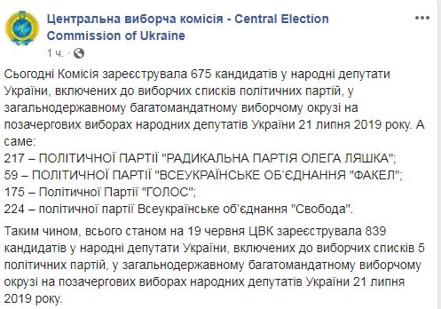 Так, были зарегистрированы 217 кандидатов от "Радикальной партии Олега Ляшко", 59 – от Всеукраинского объединения "Факел", 175 – от партии "Голос" и 224 – от партии "Свобода".