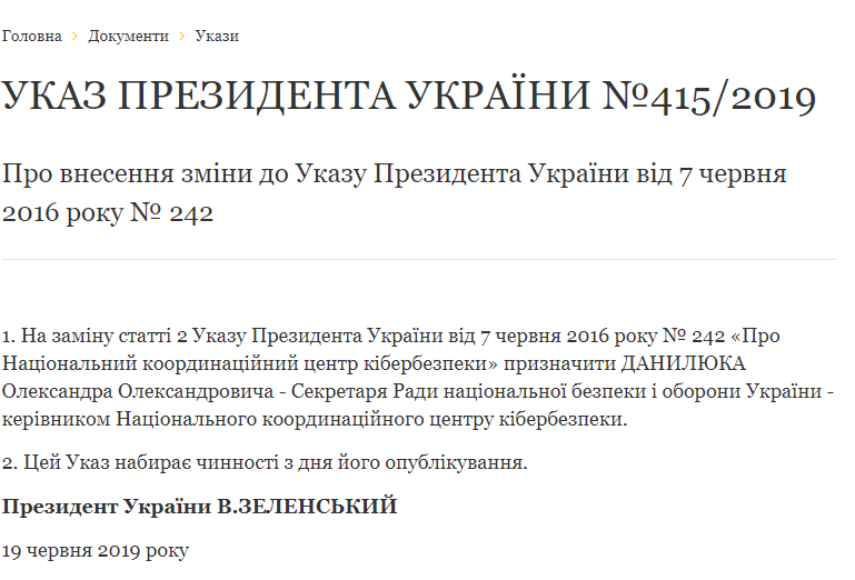 "На замену статьи 2 указа президента Украины от 7 июня 2016 года №242 "О Национальном координационном центре кибербезопасности" назначить Данилюка Александра Александровича – секретаря Совета национальной безопасности и обороны Украины – руководителем Национального координационного центра кибербезопасности", – говорится в указе №415 от 19 июня.