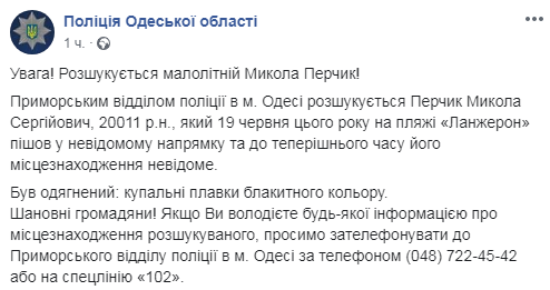 Приморским отделом полиции в г.Одессе разыскивается Перчик Николай Сергеевич, 2011 года рождения. В среду, 19 июня, он находясь на пляже "Ланжерон" ушел в неизвестном направлении. Местонахождение неизвестно.