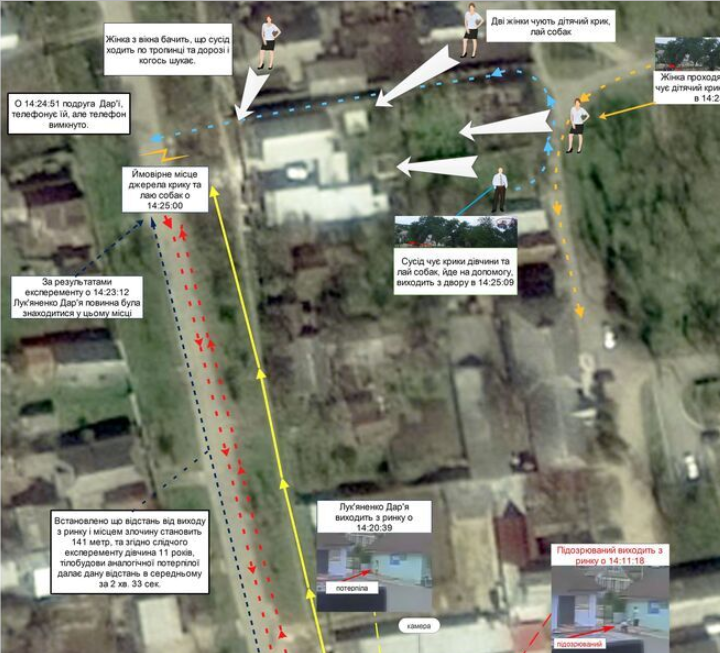 Камеры зафиксировали, как подозреваемый вышел с рынка в 14:11, а девочка - в 14:20. В 14:24 ей позвонила подруга, но телефон уже был выключен, а около 14:25 несколько соседей услышали детский крик и лай собак.