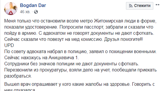 "Меня только что остановили возле метро Житомирская люди в форме, показали удостоверение. Попросили паспорт, забрали и сказали, что пойду в армию. С адвокатом не говорят, документы не дают сфоткать. Сейчас сказали что повезут на мед комиссию. Друзья, помогите!