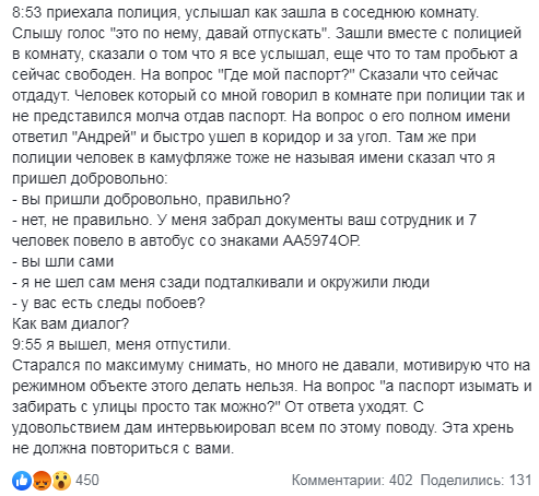 Богдан Дар фиксировал происходящее и дополнял свою заметку, а также оперативно связался с адвокатом. В итоге, после приезда полиции на вызов, его отпустили.