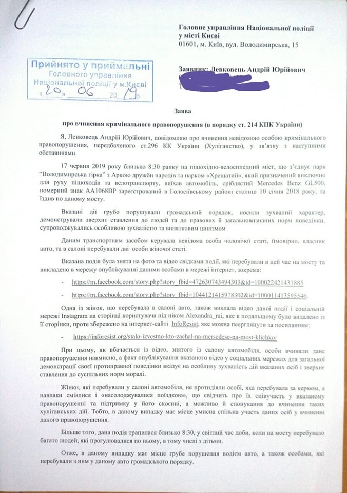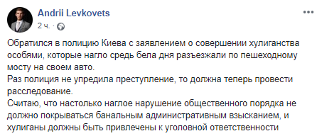 Адвокат АО Barristers Андрей Левковец считает, что водитель автомобиля Mercedes, который проехал по новому стеклянному пешеходному мосту в Киеве, должен быть привлечен не к административной ответственности, а к уголовной. В связи с этим юрист 20 июня 2019 подал заявление в столичное ГУ Национальной полиции заявление о совершения уголовного преступления водителем Mercedes. Об этом адвокат сообщил на своей странице в соцсети.