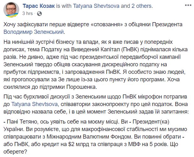 Об этом президент дал понять на встрече с бизнес-сообществом в четверг в Киеве, написал у себя в Facebook участник встречи Тарас Козак.