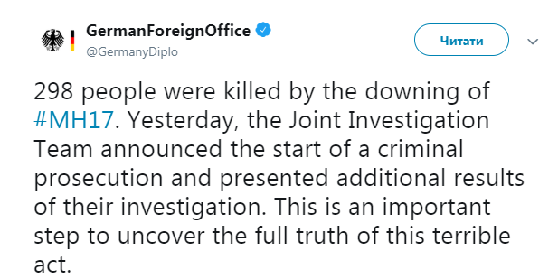 "298 человек погибли в результате катастрофы самолета MH17. Совместная следственная группа объявила о начале уголовного преследования и представила дополнительные результаты своего расследования. Это важный шаг, чтобы раскрыть полную правду этого ужасного акта", - говорится в заявлении ведомства.