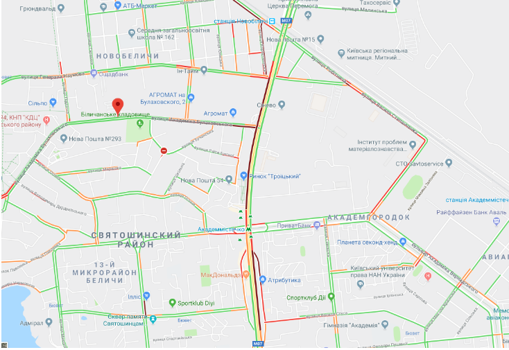 Согласно данным сервиса Google Maps, по состоянию на 08:30 движение парализовано от проспекта Генерала Наумова по проспекту Академика Палладина и Большой окружной дороге до начала проспекта Победы.