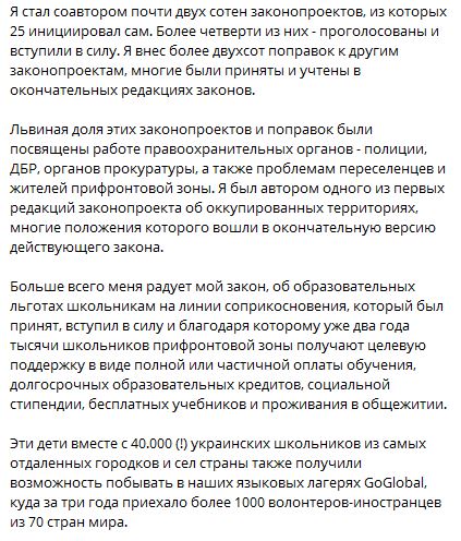 "Я принял решение не баллотироваться в следующий созыв Верховной Рады. Объединения тех, с кем хотелось бы работать, не случилось - многие единомышленники идут в парламент по разным спискам. А баллотироваться по мажоритарному округу и в очередной раз оказаться в парламенте без команды - считаю неправильным. Мандат любой ценой мне не интересен", - объяснил он.
