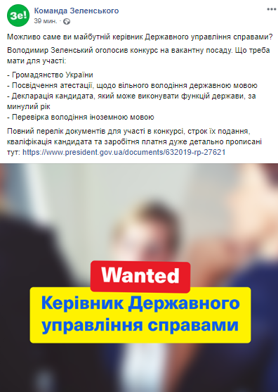 "Возможно именно вы будущий руководитель Государственного управления делами? Владимир Зеленский объявил конкурс на вакантную должность", - говорится в сообщении.