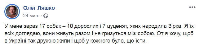 "У меня сейчас 17 собак - 10 взрослых и 7 щенков, которых родила Зирка. Я их всех ухаживаю, они живут вместе и не грызутся между собой. Вот я хочу, чтобы в Украине так дружно жили и чтобы у каждого было, что есть", - процитировал депутат свое интервью в Facebook.