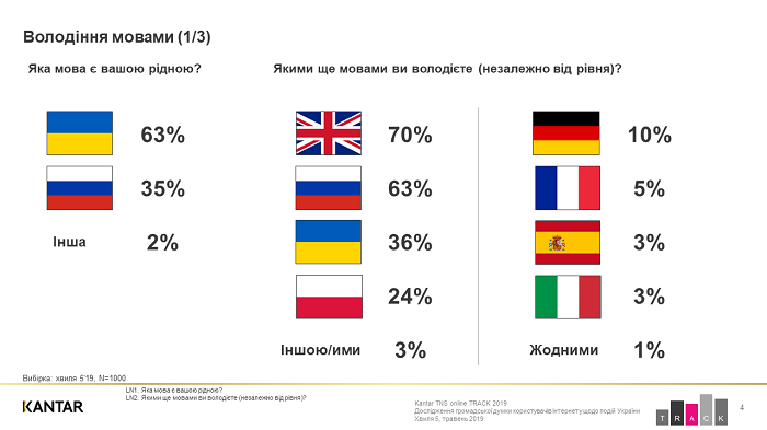 Респонденты оценивают свое знание украинского и русского языков на уровне выше среднего (средняя оценка 7,4 для обоих языков). Кроме родного, украинцы знают также английский (70%), русский (63%), украинский (36%), и польский языки (24%).