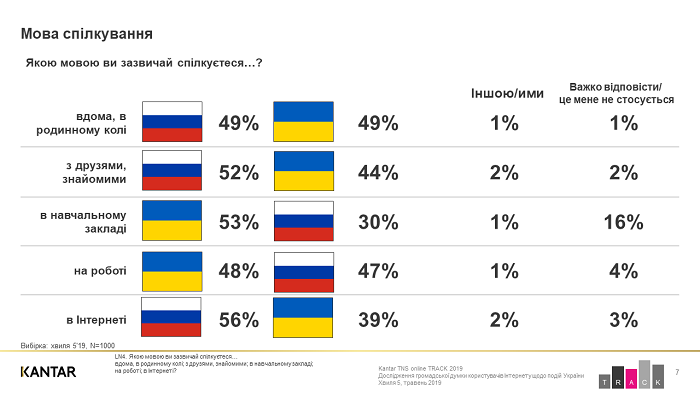 Ожидаемо, что украинский язык чаще используют на западе и в центре страны, а также в малых населенных пунктах. Русский язык является основным на востоке и юге, а также в крупных городах. При этом треть опрошенных (31%) считает, что русский язык следует преподавать в школах, а 15% выступают за предоставление русскому языку официального статуса в некоторых регионах Украины.