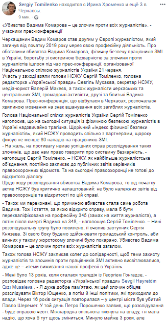 Сегодня в КУиеве прошла пресс-конференция НСЖУ, на которой были озвучены  обстоятельства убийства Вадима Комарова. Также речь шла о физической безопасности работников СМИ в Украине, борьбе с системной безнаказанностью за преступления против журналистов.