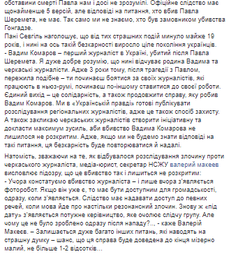 "Также мы убеждены, что причиной убийства стала именно работа Вадима. Поэтому и статья, по которой возбуждено дело, должна быть переквалифицировано на профессиональную 345 (покушение на жизнь журналиста), а затем после смерти Вадима на 348-ю. Сейчас следственная группа была усилена, ее возглавил заместитель Сергея Князева. Со своей стороны будем осуществлять общественный контроль, чтобы виновные в таком жестоком преступлении были наказаны. Убийство Вадима Комарова - это преступление против всех журналистов в целом", - отметил Томиленко и призвал коллег к солидарности, чтобы темы защиты журналистов и преступлений против работников СМИ активно освещались, ведь это - "темы выживания нашей профессии в Украине".