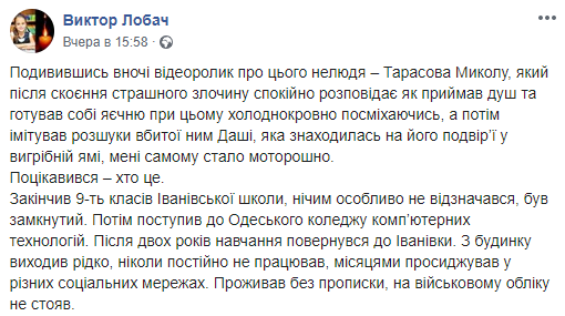 Начальник ГУНП в Одесской области Олег Бех на брифинге заявлял, что по мнению правоохранителей Тарасов абсолютно вменяем. "Тактически заметал следы. Психически нездоровый человек этого не делает", - пояснил полицейский.