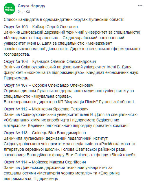 В пятницу, 21 июня, партия президента Украины "Слуга народа" опубликовала данные своих кандидатов в одномандатных округах Луганской области на досрочных выборах 21 июля. Список обнародован в группе политсилы в Facebook.