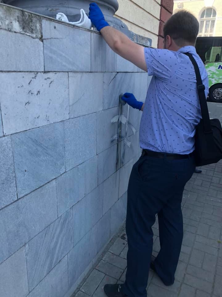 "Убрали "общественный туалет", собрали мусор и бутылки вокруг, отмыли ещё часть "наскальных рисунков" пещерных людей, а так же помыли сам монумент. Следующий шаг - акцентировать внимание на необходимости реставрации. Постараюсь на днях узнать размеры "колодки" от медали "За Отвагу". Если не отреагируют - изготовлю за свой счёт", - написал он.