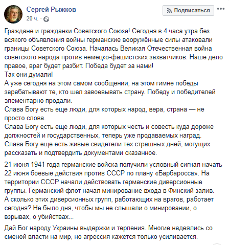 Так они думали! А уже сегодня на этом самом сообщении, на этом гимне победы зарабатывают те, кто шел завоевывать страну. Победу и победителей элементарно продали. Слава Богу есть еще люди, для которых народ, вера, страна — не просто слова. Слава Богу есть еще люди, для которых честь и совесть куда дороже должностей и государственных, теперь уже продаваемых наград. Слава Богу еще есть живые свидетели тех страшных дней, могущих рассказать и подтвердить документами сказанное...." - написал он.