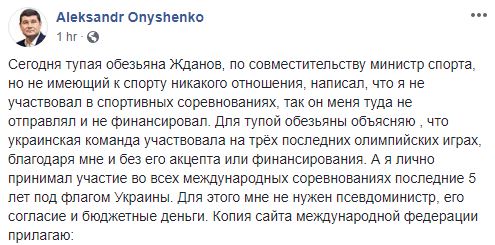 "Для тупой обезьяны объясняю, что украинская команда участвовала на трёх последних олимпийских играх, благодаря мне и без его акцепта или финансирования. А я лично принимал участие во всех международных соревнованиях последние 5 лет под флагом Украины. Для этого мне не нужен псевдоминистр, его согласие и бюджетные деньги", - написал он на своей странице в Facebook.