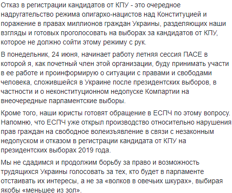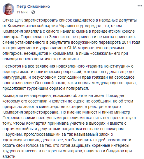 "Отказ ЦИК зарегистрировать список кандидатов в народные депутаты от Коммунистической партии Украины подтверждает, то, о чем Компартия заявляла с самого начала: смена в президентском кресле олигарха Порошенко на Зеленского не привела и не могла привести к смене установленного в результате вооруженного переворота 2014 года контролируемого и управляемого США марионеточного режима олигархов, неонацистов и криминала, а лишь "освежила" его при помощи легкого политического макияжа", - написал он в сети.
