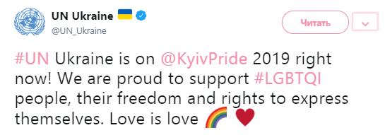"ООН Украина на KyivPride 2019 прямо сейчас! Мы гордимся тем, что поддерживаем людей ЛГБТИК, их свободу и права на самовыражение. Любовь есть любовь", - говорится в заявлении миссии.