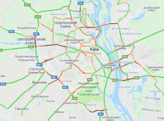 Достаточно медленно автомобили движутся на Большой окружной дороге, проспекте Голосеевском, бульваре Леси Украинки, Владимирском спуске, улицах Саксаганского, Жилянской, Богдана Хмельницкого, Бассейной, Большой Житомирской, Набережно-Крещатицкая, Короленковской.