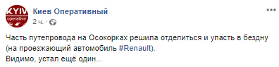 "Часть путепровода на Осокорках решила отделиться и упасть в бездну (на проезжающий автомобиль Renault). Видимо, устал еще один", - говорится в сообщении.